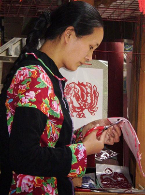 剪纸是中国民间流行的一种历史悠久的镂空艺术。所谓剪纸,就是用剪刀将纸剪成各种各样的图案,如窗花、门笺、墙花、顶棚花、灯花等。每逢过节或新婚喜庆,人们便将美丽鲜艳的剪纸贴在家中窗户、墙壁、门和灯笼上,节日的气氛也因此被烘托得更加热烈。在农村,剪纸通常是由妇女、姑娘们来做。在过去,剪纸几乎可以说是每个女孩所必须掌握的手工艺术,并且还被人们来品评新娘的一个标准。