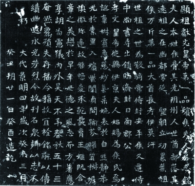 释文:显祖献文皇帝第一品嫔侯夫人墓志铭。夫人本姓侯骨,其先朔州人,世酋部落。其远祖之在幽都,常从圣朝,立功累叶。祖俟万斤,第一品大酋长。考伊莫汗,世祖之世,为散骑常侍,封安平侯,又迁侍中尚书,寻出镇临济,封曰南郡公。孝文皇帝徙县伊京,夫人始赐为侯氏焉。诞禀婌灵,应兹妙气,柔婉表于自然,静恭光于素里。入嫔紫闱,贞问逾芬;曜质椒墀,慎徽弥远。故能协庆承干,载育王姬。既含章之美,懋于早年;母德之风,志而方着。应享胡苟,灵仪内外。昊天不吊,春秋五十三奄然薨殒。夫存播令称,故宜旌铭,所以传绩幽遐,永光芳烈,今故刊石泉乡,以志不朽。大代景明四年岁次癸未三月癸丑朔廿一日癸酉造讫。