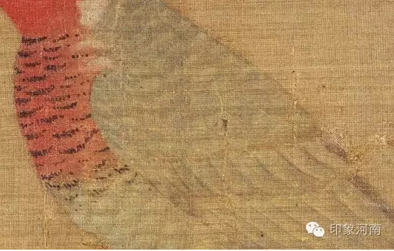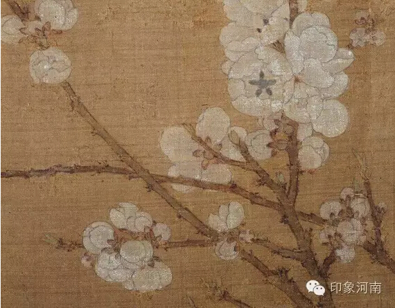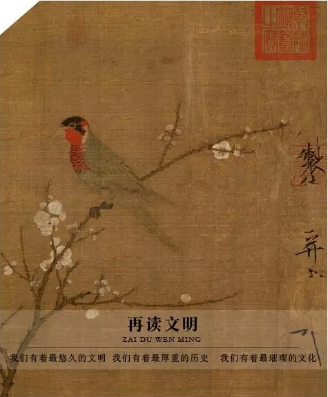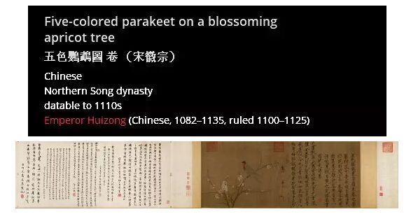 宋徽宗热爱画花鸟画自成“院体”,《五色鹦鹉图》卷中绘折枝杏花两枝,一只五色鹦鹉侧身栖于盛开的杏花枝头,画中鹦鹉嘴厚眼圆颈粗、羽翼齐整、足脚有力,站立于花枝上,显得心满意足,无忧无虑。花瓣先勾后染,白中透出稍许粉红。鹦鹉红色部分著色虽富丽,给人的感觉却是艳而不俗。