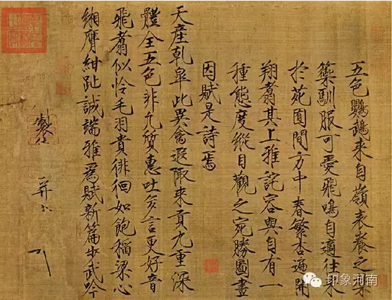 (《五色鹦鹉图》卷流传有绪,幅上的“天历之宝”玺表明它为元内府所有,明末归戴明说, 清初属宋犖,后入清乾隆、嘉庆皇帝内府,全卷为乾隆内府重裱。重裱时,徽宗的题诗被移到了前面,《石渠宝笈初编》卷二十六著录。此后,赏赐恭亲王奕訢,辛亥革命后被其孙溥伟、溥儒等售予古董商,1925年为张允中在琉璃厂购得,他连题五跋,确认此系徽宗之作,考证其流传过程,并核对与《石渠宝笈》的记载无误。后为日本山本悌二郎购得,著录于其1931年刊印的《澄怀堂书画目录》中,二战后其后人售予波士顿美术馆。)
