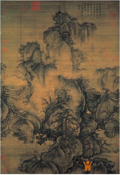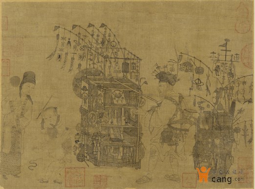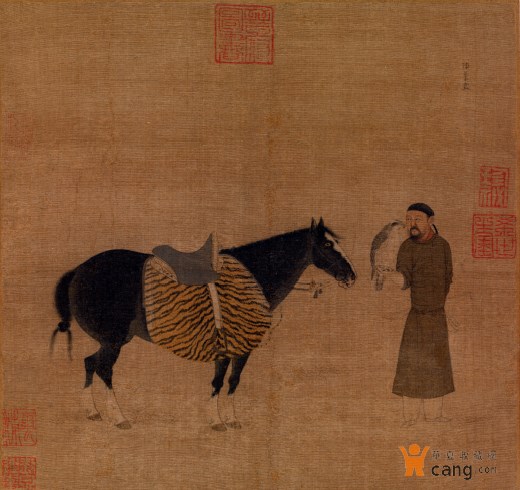 对现存山西太原晋王府藏品的出色研究已证实,明初藩王们所收藏的画作大部分来源于早期的皇家收藏(再往前可追溯至宋元的皇家收藏)。班宗华在姜一涵研究成果的基础上,鉴定了33件早期书法和绘画的真品,上有晋府的各式钤印。其中的15件同样有着明初皇家内府收藏的半印“司印”,表明它们也是来自明太祖给予晋王的赏赐,很可能就是在他获封的1378年。这批最初的赏赐中包括现存明代以前传世之作中最有声望和权威的一些作品,例如北宋具有里程碑地位的山水画,作于1072 年的郭熙的《早春图》,还有一度被认为是卫贤作品的《闸口盘车图》,现藏于上海博物馆。我们有充分理由认为如今可以鉴别的只是原有丰富收藏中很小的一部分。而且新的作品继续被添加到这批藏品中,比如被归为陈居中之作的画着一位驯鹰人和一匹马的小幅作品,画的正中上缘(这是皇室和王府鉴藏印的特殊位置)印有“晋府图书”。而且我们可以推断,晋王府的收藏至少和朱元璋其他儿子的一些收藏不相上下,其他那些现已散佚的收藏只能在我们的想象中再现,或是仅以更加支离破碎的形式传世。