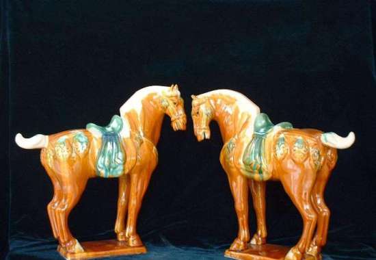 唐三彩的烧造是采用二次烧成法,先将雕塑成型干燥后,入窑以1000℃以上温度素烧,再施以各种釉料入窑釉烧,烧成温度为900℃左右。胎料以当地出产的白色高岭土为主。唐三彩釉属低温透明釉,胎体上的任何疵点在施釉烧成后都会直观地显现出来,因此对胎体要求较高。在釉烧过程中,釉融化后自然垂流,相互浸润,产生出意想不到的艺术效果,而且胎釉结合好,釉彩不易脱落,是一种具有独特风格的传统工艺品。