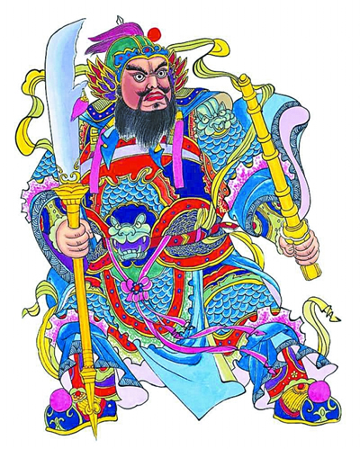 关羽、张飞:关、张二人是《三国演义》中的英雄,刘、关、张义气千秋,世人景仰。刘备贵为天子,不可能做看家守院的门神。关羽被誉为忠义的化身,号称“武圣人”、“关圣帝君”,旧社会被人们敬为保护神,至今仍在海内外享有盛誉。张飞有万夫莫当之勇,曾率20余名骑兵于长坂坡喝退曹军,被誉为勇猛的化身。人们敬重二人忠义刚猛,遂尊为门神。焦作民间传说,关羽、张飞起自平民百姓,后来位居王侯,死后封神,因此非常适合一般家户祀奉。值得注意的是,二人谐音“关张”,所以开门做生意的商户可以供奉关公做财神,但不能供关、张为门神。
