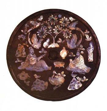 螺钿镜,直径25厘米。背有带孔圆钮,并以海蚌贝壳 镶嵌成宴饮图案。镜的中心盘坐两位老者,右为主人,持杯饮酒,左者弹琵琶,背后立女, 双手捧盒,面前放一鼎一壶。镜的上部是一棵花树,空悬一轮明月,树叶两侧有小鸟翔, 树左蹲一只猫,树干两边各有一只鹦鹉。镜下部有仙鹤、水池和站立、游水的鸳鸯。画面 空间飞满了花瓣。画面广阔,景色恬静中有动感,表现出封建士大夫悠闲自得的生活情景。