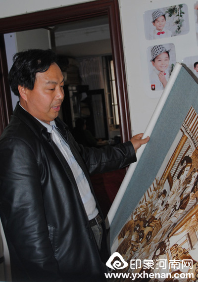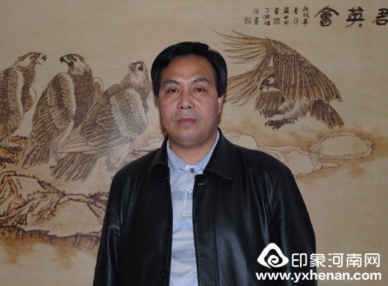 丁洪强便是这样一位专攻烙画技艺的民间工艺美术大师。他的工作室位于郑州市区的一座小区里,室内挂满一幅又一幅的烙画作品,宣纸烙画、葫芦烙画、木板烙画、丝绢烙画……整间屋子充满了浓郁的艺术气息。在众多的烙画材料中,葫芦烙画是最早产生并传播的。葫芦烙画有线条简洁,自然,明快,流畅的特点,并且取材广泛,人物、花鸟、禽兽、山水、书法等都能以烙画的形式展现出来,融汇各家画派画风为一体,精妙无比。葫芦烙画的表现力具有一定的浮雕效果,色泽呈深浅褐色,古朴典雅,清新秀丽,别具一格。这也是这么多年丁洪强一直坚持在葫芦上烙画的原因。相对于葫芦烙画,宣纸烙画可要难的多了,宣纸太薄,而用来烙画的烙笔是靠高温熨出烙痕来作画的,稍不留神,宣纸就被烫破了。所以,能在宣纸上进行烙画的人,寥寥无几。丁洪强凭着自己这么多年的勤学苦练,在宣纸上烙画已经很得心应手了。除了宣纸,木板烙画也是丁洪强的拿手绝活。丁洪强的新作《五大伟人图》和《群英会》都是木板烙画中的精品。