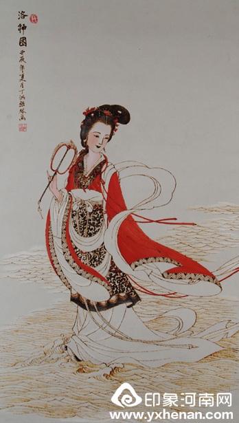 《洛神图》这幅烙画可以说是丁洪强众多艺术作品中的杰出代表。整幅作品给人一种飘逸轻盈的感觉,图中的洛神手执薄扇,低首轻笑,媚而不娇,其中眉眼的刻画尤为动人,使一种羞赧婉约的感觉跃然纸上。最妙的是洛神装束的烙绘,曲线的层叠非但不给人一种繁杂感,而是让人体会到一种灵动。洛神的衣着配以鲜艳的红色,可以说是点睛之笔,整幅图中红色夺目却不夸张,再辅以洛神羞赧的表情,可以说是动人之极了。
