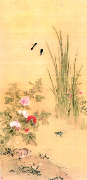 清代画家余樨所绘的《端阳景图》,以挺秀细润的笔法,将菖蒲、蜀葵、豆娘、蟾蜍和青蛙等动植物生动逼真地刻画出来:在日丽水暖的郊外,野花竞相绽放,各种植物蓬勃生长,青蛙、蟾蜍和豆娘等动物在明媚的阳光中跳跃、飞翔,一派生机盎然、欣欣向荣的景象。