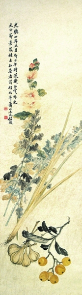 任颐的《端午图》,以直立的艾草、菖蒲、蜀葵为主要表现对象,以地面上摆放的枇杷、蒜头为辅。构图取新颖之姿,用笔用色讲究韵味和文人趣味。图中物象,皆与端午习俗有关。