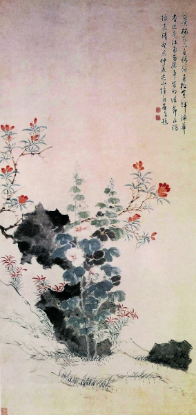 此图所画即是端午节时陆治亲手所植花木的芳姿。图中的湖石是背景和衬托,故仅用淡墨干笔渲染造型,复加以苔点,颇显意趣;而萱草、蜀葵、石榴等花叶,均以勾花点叶法重点刻画,勾笔细劲如铁线,而点叶则用笔较拘谨,但温润沉着;野草灌木则直接以没骨画法用色彩点染写出,显得生趣盎然。