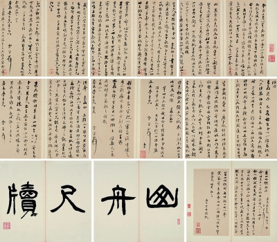 我国书法的形制最初由工具材料所决定,纵式书写方式起源于殷商时期的甲骨文,而后经摩崖、壁画、碑碣的一再认同,最终发展为“立轴”“屏条”“对联”等自上而下的书写形制。古人还发明了横向书写格式,由最初的“匾额”,发展为“横批”和“手卷”。书法成为挥洒人们精神意趣的最佳表现手段。中国的书法可以说是由最具实用功能而又带有私密封闭性质的“尺牍”开始,逐渐走向多样化的表现形式和开放的空间形态,由“尺牍”演变为“书(诗)稿”“奏章”“诔文”“匾额”“楹联”“扇面”“屏条”“斗方”等多种可能的表现形式,也就在情理之中。