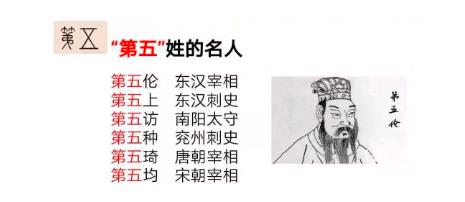 在历史上,第五氏出名的人物有东汉宰相第五伦,东汉刺史第五上,南阳太守第五访,兖州刺史第五种,唐代宰相第五琦,宋朝宰相第五均等。