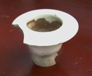 7.试釉片:出现了大量的以天青釉为基色的深浅不一有各色阶釉面的试烧片,这些试釉片大部采用器物素烧的残片进行试烧,一部分用较标准的梯形半釉半素且带圆孔的瓷片试烧,釉色由浅(月白)到深(深青灰),色差较大、品种较多、色相不稳