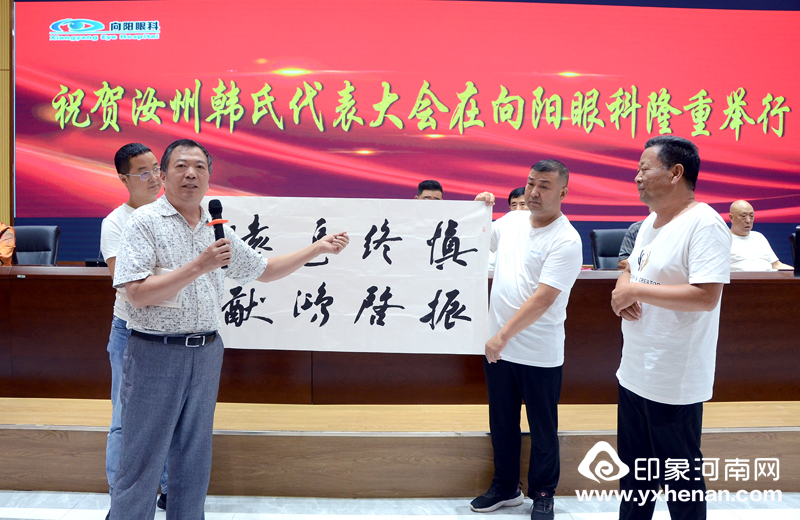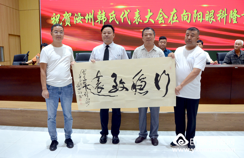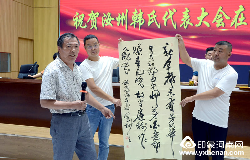 大会上,河南省姓氏文化研究会韩姓委员会副会长韩湘人向大会赠送书法作品表示祝贺。