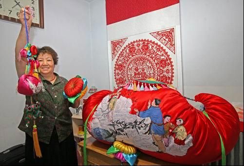 河南非物质文化传承人,陕县民间艺人朱秀云从上海世博会参加河南周回到家中,就紧张忙碌制作了高1.8米,宽1.2米,重约20多公斤的河南最大“牛头荷包”。她高兴的说:“农历七月初七是民间牛郎会织女的日子,也是我们中国传统佳节,我用3个月时间赶制这个大香包上绣有牛郎和织女,并绣了喜鹊为她们搭桥相会,这个荷包还要参加广东全国首届七夕风情文化节呢。”