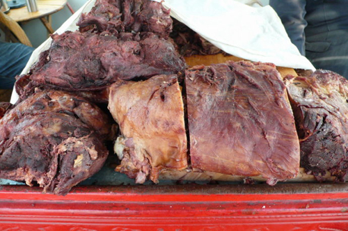 鬼子肉"即五香驴肉,因驴的相貌丑陋,像封建迷信中的牛头马面,在旧时,称驴为鬼,民间也就把加工好的驴肉称为“鬼子肉”。