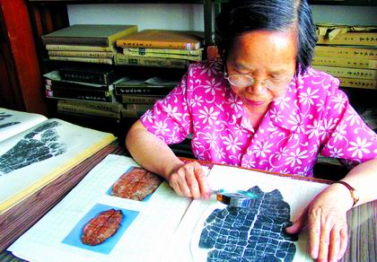 中国社会科学院考古研究所刘一曼教授在对甲骨文拓片进行研究。