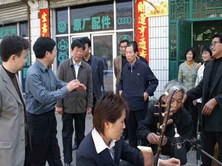 米河镇党委书记闫红涛在与戏曲协会的会员们亲切交谈