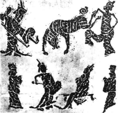 “校猎·聂政自屠”汉画像石画面分上下两部分。上图为“校猎”:刻两武士搏缚一头牛;下图两边各刻一人,中间一人袒胸仰首作刎状,一人戴高冠坐于几上有向后倒之状。此图刻的是著名的历史故事“聂政自屠”(见《史记·刺客列传》)。