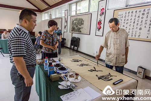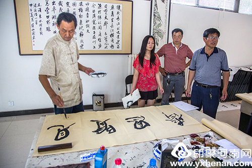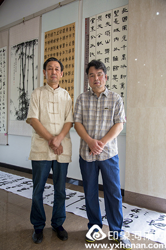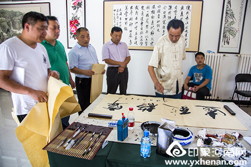 左一为傅伟华老师 傅伟华在荥阳书画院挥毫泼墨 傅伟华与荥阳书协主席合影