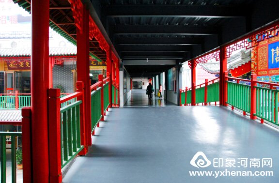 一见倾心。咋一看,人们肯定最先被古香古色的整体建筑所吸引。唐人街文化广场有三个街区,东街、西街、唐人街。街门牌楼风格别致,都是错落有致的卷棚式屋顶,三座屋顶构成一组中间为主两侧稍低的亭榭式建筑。其上匾额蓝底金字,周围绘有精美的花纹及金龙图案,看起来恢宏大气。站在广场中间,放眼望去,整个建筑红绿搭配,整齐划一。全仿古的门面牌匾和大红的灯笼点缀其中,映衬着灰墙青瓦、红柱绿栏,尽显古朴典雅之感。