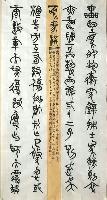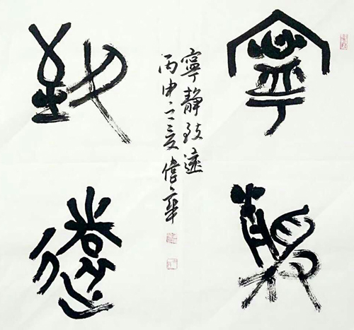 观其篆书,长于金文大篆体,运笔娴熟,厚实而又凝练的笔迹游走于宣纸上,力透纸背;笔随意至,气息舒畅,可见他控制线条的能力很强。书学有论:“藏锋以包其气,露锋以纵其神。”傅伟华用笔的藏露锋间均有法度之妙,气足神完。其篆书点画浓淡燥湿、欹正方圆、轻重徐疾无不遒劲畅达,干净利落,浑然天成;单字结体空灵多变,造型优美,整体章法开张大气,完整性好。赏之,时而觉得雄强古拙,自由狂放;时而觉得温文尔雅,雍容华贵。一派浑穆气象,古意盎然。