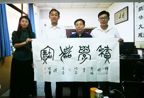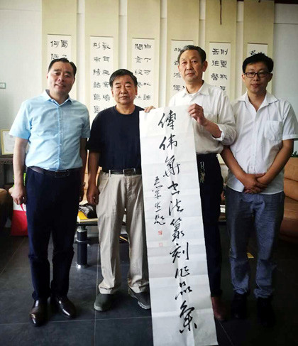 5月10上午,省报告文学学会执行会长、河南时代传媒集团董事长、《时代报告》《奔流》杂志社社长、总编辑张富领,《书法导报》社长、总编辑,中国书法家协会第四、五、六届理事,河南省书法家协会副主席王荣生,《时代报告》传媒集团秘书长兼副总编辑、《 奔流》编委李宏涛,著名书法篆刻家傅伟华,诗人、记者、书法家、独立评论员周帅伟,张姗姗女士等名家聚集《时代报告》传媒集团,交流研讨篆刻书法文化及红色公益书法文化。