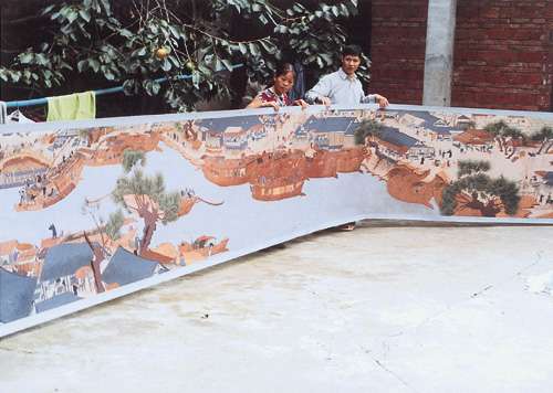 布雕画能体现出材料的古朴美,传递著浅浮雕的机理美,给你带去一丝与众不同的新鲜与愉悦。他的布雕画代表作品有《清明上河图》、《八十七神仙卷》、《古代军戎服饰图》、《搜山图》等。