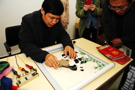 他拿起一支修录音机的烙铁,开始在一块布上一笔一笔地画着,在众人惊讶之中,一只熊猫跃然“布”上。