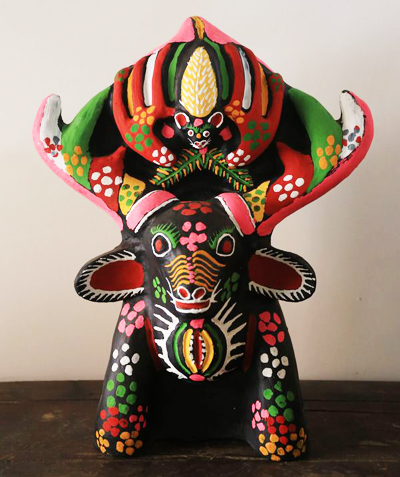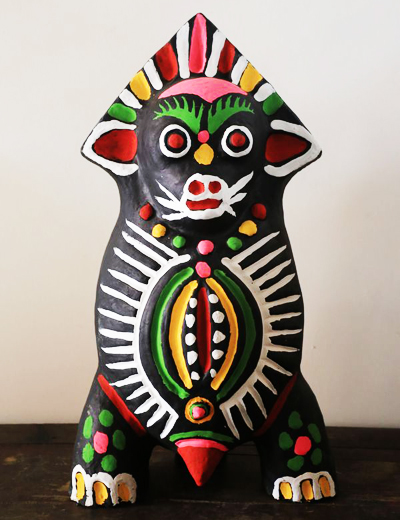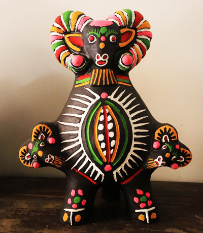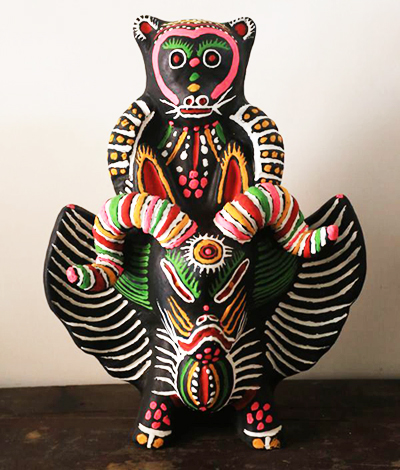 张华伟的作品取材独特,造型怪诞,色彩艳而不俗,纹饰自由随意,充满浓厚的古朴气息。代表作品有《人祖猴》。