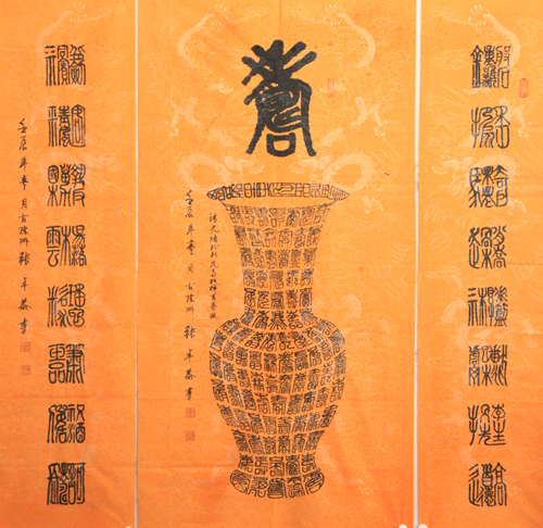 此幅八仙祝寿瓶,蕴涵了中国传统的孝道文化,是将古代八仙祝寿的神话传说与现代人们生日祝寿结合起来而创作出的新的艺术形式。作品一组以传统的中堂对联形式布局,中间一个瓶子,瓶内书写有一百个异体寿字,作品的中上方书有一个比较大的篆书“寿”字。两边各有一副对联,上联为“钟离磐石把扇摇,果老骑驴过肖桥;湘子花篮献蟠桃,拐李先生道德高。”下联为“洞宾背剑清风客,国舅执板云阳落;彩和瑶池玉箫品,仙姑祝酒长寿歌。”整幅作品表达的是人们对吉祥长寿的美好祝愿。