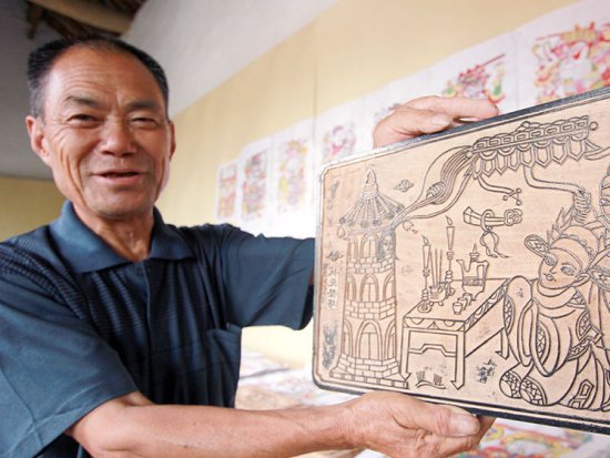 夏明月向我们展示一块已经制作好的木版年画模板。