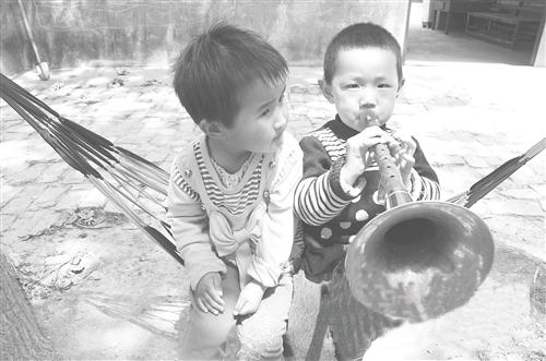 图为第七代传人刘琦和刘妞妞坐着悠悠练习吹唢呐。