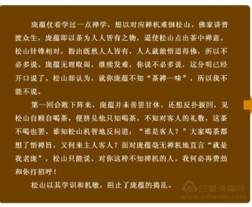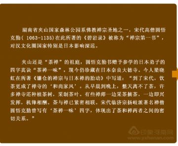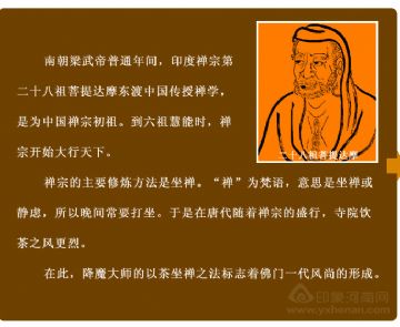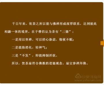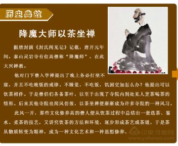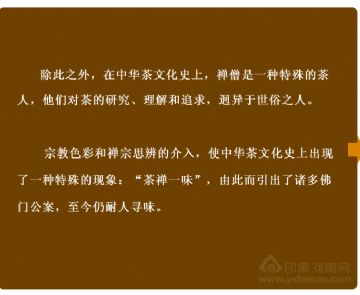 除此之外,在中华茶文化史上,禅僧是一种特殊的茶人,他们对茶的研究、理解和追求,迥异于世俗之人。宗教色彩和禅宗思辨的介入,使中华茶文化史上出现了一种特殊的现象:“茶禅一味”,由此而引出了诸多佛门公案,至今仍耐人寻味。