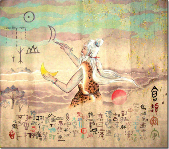 有一年,仓颉到南方巡狩,登上一座阳虚之山(现在陕西省雒南县),临于玄扈洛邙之水,忽然看见一只大龟,龟背上面有许多青色花纹。仓颉看了觉得稀奇,就取来细细研究。他看来看去,发现龟背上的花纹竟有意义可通的。他想花纹既能表示意义,如果定下一个规则,岂不是人人都可用来传达心意,记载事情么?