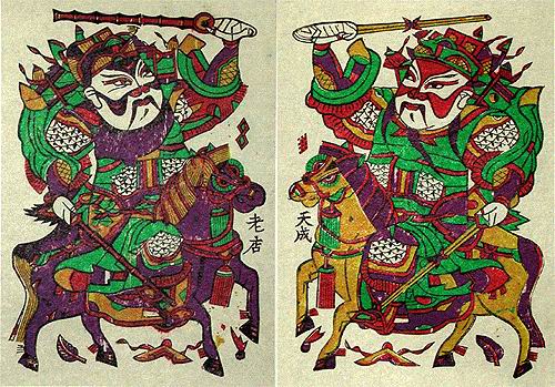 我国各地过年都有贴门神的风俗。最初的门神是刻桃木为人形,挂在人的旁边,后来是画成门神人像张贴于门。传说中的神荼、郁垒兄弟二人专门管鬼,有他们守住门户,大小恶鬼不敢入门为害。唐代以后,又有画猛将秦琼、尉迟敬德二人像为门神的,还有画关羽、张飞像为门神的。门神像左右户各一张,后代常把一对门神画成一文一武。门神分三类:第一类是“大门门神”,多贴在车门或整间大门上,高约四五尺,宽约二三尺。第二类是“街门门神”,多贴小街门上,高约二尺,宽约一尺。这两种门神都是一黑脸一白脸两位尊神。白左黑右,白善易,黑狞恶,各手执槊钺。第三类是“屋门门神”,较街门门神稍小有限,也是黑白二神,但也有黑白二神是坐像的。屋门最多是贴“麒麟送子”像,两个傅粉涂脂梳太子冠的娃娃,各乘麒麟。这种门神,本应贴在新结婚的屋门上,以取吉利,后来也就作普通街门的新年点缀品了。