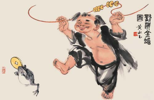 有一年冬天,大雪纷飞,寒风刺骨,刘海顶风冒雪,上山砍柴,希望能换回点粮米度日。他挥动着斧头砍呀砍呀,不知砍了多久,才砍够了两大捆柴,正准备挑柴下山,忽然听到一阵呼救声,寻声找去,不见人影,却见一棵大树下,一条长蛇正扑向一只金蟾,金蟾左躲右闪,遍体是伤,十分危险。刘海急中生智,大喝一声,挥起扁担向蛇头打去,蛇摆了几下尾巴,便不动了。刘海找了些草药嚼碎涂在金蟾的伤口上,那金蟾突然说话了:“谢谢您,恩人!您会得到幸福的。说完,从嘴里吐出一卷画来,送给刘海,说:“以后,您如遇上为难事>在画面上轻轻拍三下,我会来帮助您的。”说完,突然不见了。