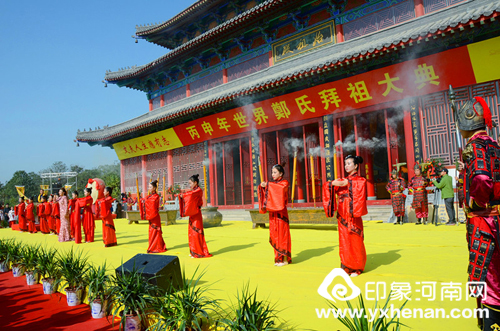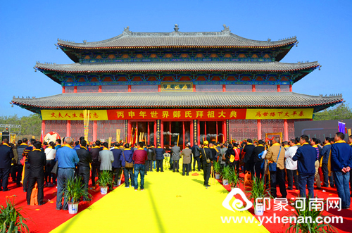 敬祖弘德,共聚荥阳。2016年11月11日,中国荥阳丙申年世界郑氏拜祖大典在荥阳郑氏名人苑隆重举行。拜祖大典由河南省郑文化研究院主办,来自福建、广东、湖南、四川、山东、浙江、江苏、江西、湖北、广西、河南、河北、黑龙江、吉林、辽宁、天津、重庆、上海、北京等二十余个省、市、自治区及香港、澳门特别行政区、台湾地区以及美国等地六百余位郑氏宗亲来到祖地荥阳,一同祭拜郑氏先祖。河南省社会科学院文学研究所副所长、河南省姓氏文化研究会秘书长李立新,荥阳市人民政府世界郑氏联谊中心主任郑朝阳,副主任徐海樱等领导出席。