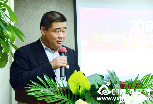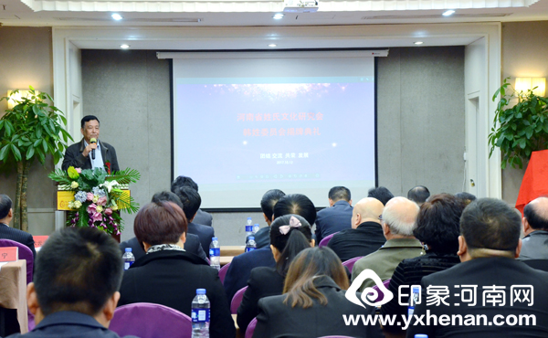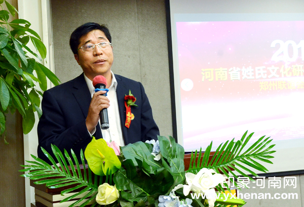 河南省姓氏文化研究会副会长石小生致辞。他讲到,祖国的情节在中国人的心目中是非常重的。祖国在先秦时期就是狭义的诸侯国,就是祖宗居住的地方。所有的姓氏其实都是和祖宗、祖国有关的,以国为姓的姓氏在中国的姓氏中占了相当大的比例,这就是对祖国的怀念。还有一种是以先祖的封地和先祖名字中的字为姓的,这都是对祖宗的一种怀念、纪念。石小生说,韩姓起源于山西,发展壮大于河南,第一个郡望为颖川郡(在今河南禹州市),所以说,韩姓委员会的成立,对我们河南省姓氏文化研究会具有很重要的意义。并希望韩姓委员会能在省姓氏文化研究会的指导下,按照国家有关的法律法规合法的开展工作。最后,石小生说,河南省姓氏文化研究会韩姓委员会正式挂牌成立,是一件非常好的事情,现在河南省姓氏文化研究会已经有74个专业委员会,5个团体会员。因为韩姓在历史上还与其他姓氏有交织,甚至同宗。所以,希望我们韩姓委员会在搞好我们自己的学术研究和对祖先的追思时,还能与其他的姓氏委员会进行一些很好的协作和研究。
