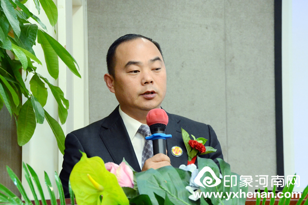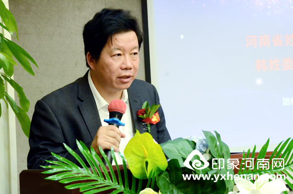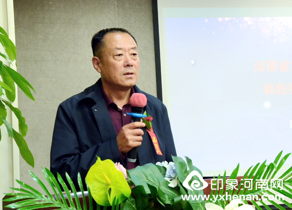 河南省姓氏文化研究会韩姓委员会会长韩跃军致辞。他讲到,河南省姓氏文化研究会韩姓委员会的获批并揭牌,是我们韩氏的一件喜事,也是一件大事。韩姓委员会的成立能促进我们韩姓文化的交流和发展。韩姓委员会自筹备以来,本着“同根同源、共谋发展、团结奉献、回报社会”的发展宗旨,在团结韩氏企业,帮助企业成长,提高经营能力,发展韩氏优秀家风文化等方面做了一些工作,受到了广泛的赞许和认同。韩氏先祖由姬姓而来,乃黄帝后裔,得姓于始祖韩万公,自公元前678年授姓以来,其后裔在历朝历代中,无论是官宦商贾还是平民百姓,都坚持以“谦逊传家久,忠厚继世长”为做人宗旨。这些坚持与人为善、严以律己、宽以待人、助人为乐的优秀品质,已经植根于我们每一个韩氏子孙的骨子里、血脉中。目前,韩姓有上千万人口,把每个地区省市的韩姓文化做好,发扬光大,这是一件非常有意义的事。韩跃军讲到,河南韩姓文化研究由于多方面的原因,存在发展起步晚和起步慢的现实情况,目前河南省内大力发展韩氏文化事业已迫在眉睫,这是每个韩氏人义不容辞的责任。他号召在场的每一位韩氏成员像老前辈一样热心付出、勇于担当、热心奉献、干好干实工作时,不忘宣传韩氏优秀文化,为社会、国家的发展做出更大的贡献。