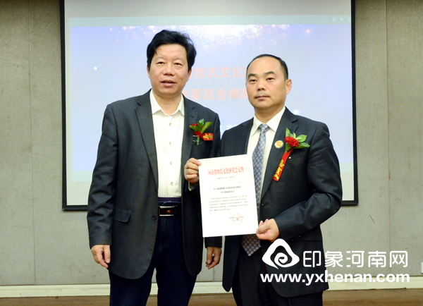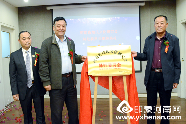 随后,河南省姓氏文化研究会副会长石小生,河南省姓氏文化研究会韩姓委员会会长韩跃军和韩姓代表韩邦太共同为河南省姓氏文化研究会韩姓委员会揭牌。