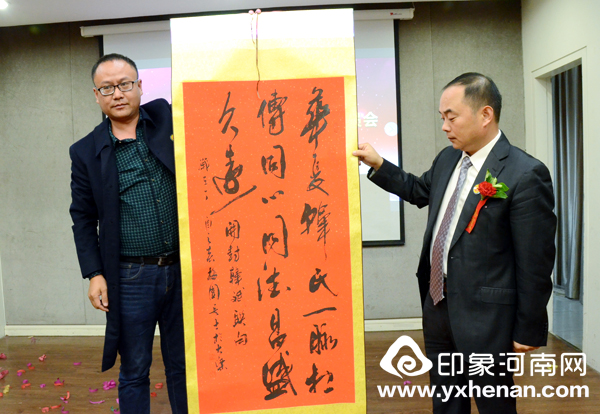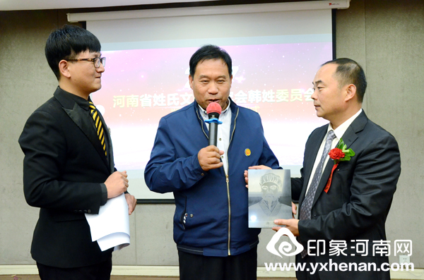 揭牌仪式上,来自开封的韩姓代表韩斌,安阳的韩姓代表韩书清,孟州的韩姓代表韩运财分别向大会赠送了书画作品和影雕像。