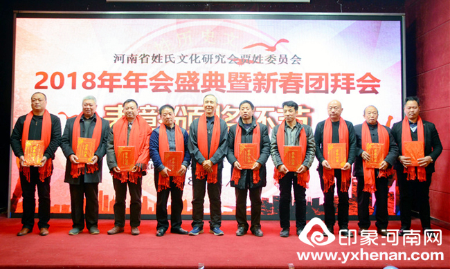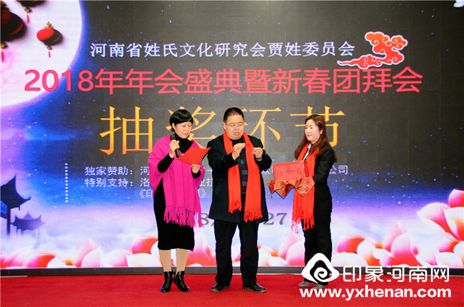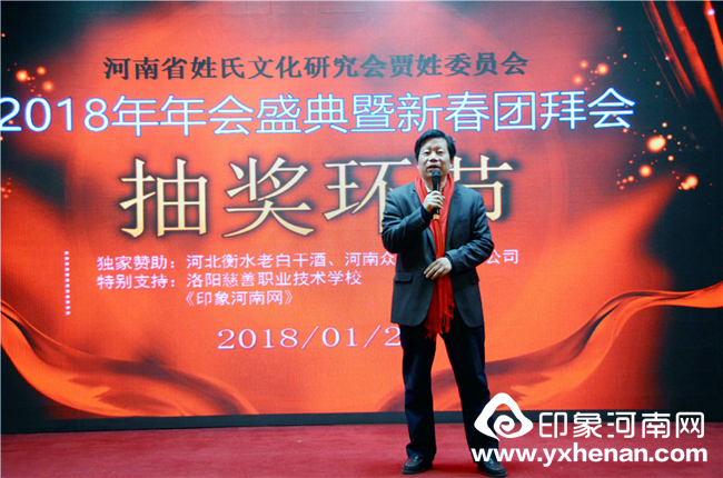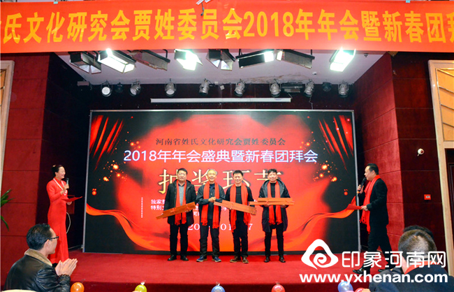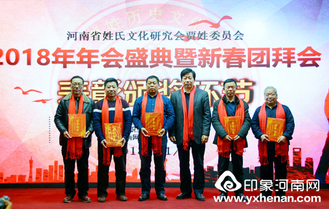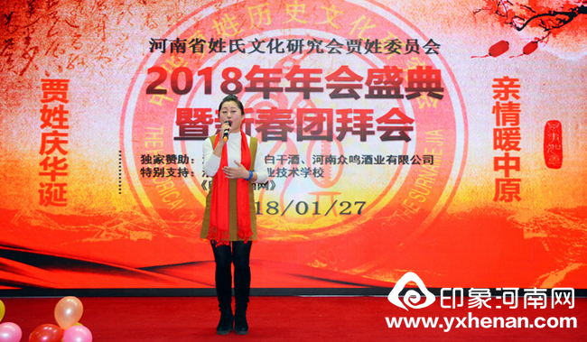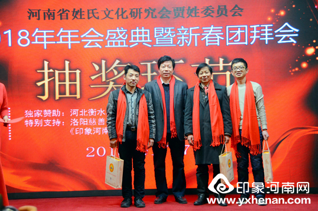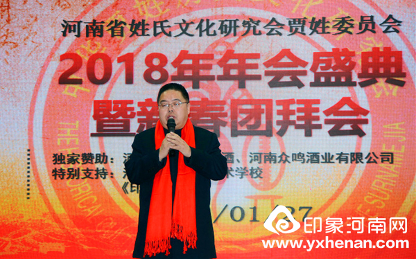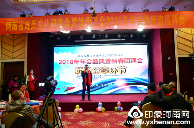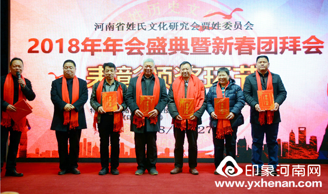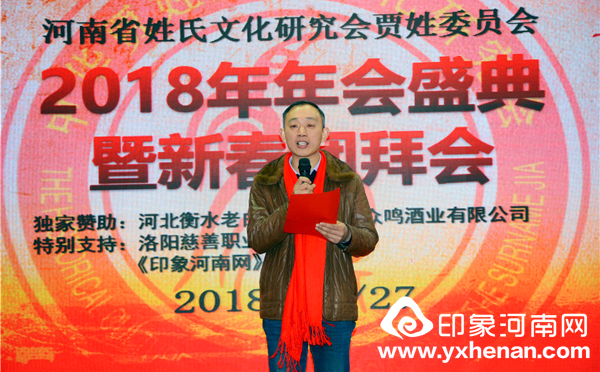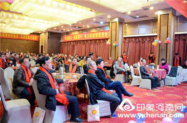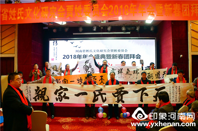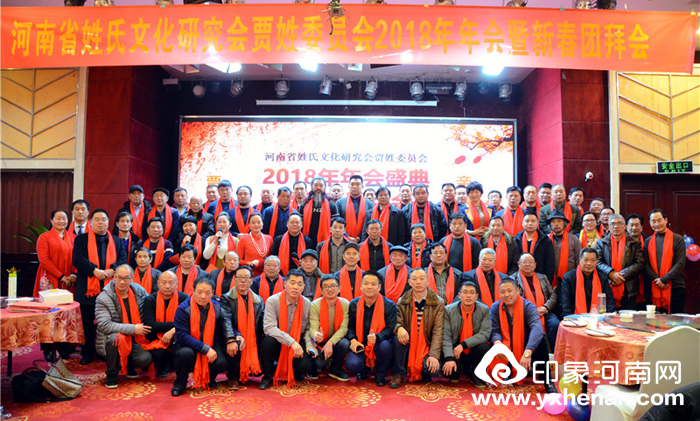 2018年1月27日上午,由河南省姓氏文化研究会贾姓委员会主办,河北衡水老白干酒、河南众鸣酒业有限公司独家赞助,洛阳慈善职业技术学校、《印象河南网》特别支持的“贾姓庆华诞,亲情暖中原”河南省姓氏文化研究会贾姓委员会2018年年会盛典暨新春团拜会在郑州举行。来自河北、山东、湖南、云南、内蒙等地以及河南省内的贾氏宗亲一百余人共聚郑州,共叙浓浓深情,共话发展愿景,共享新年喜悦。