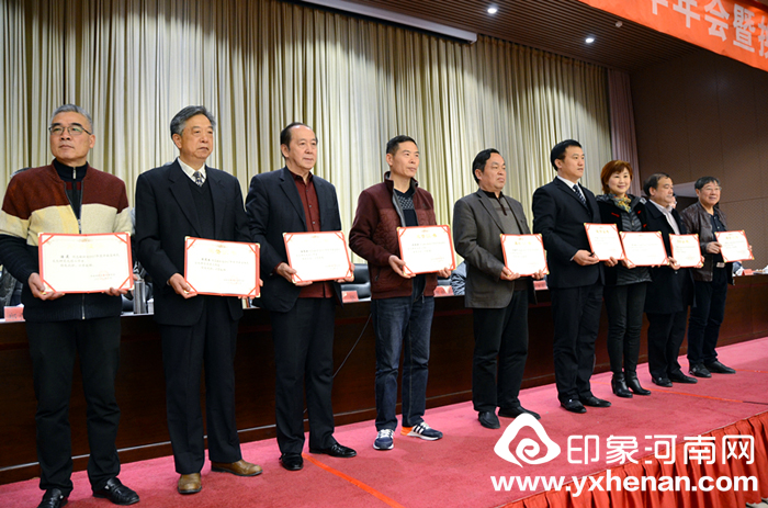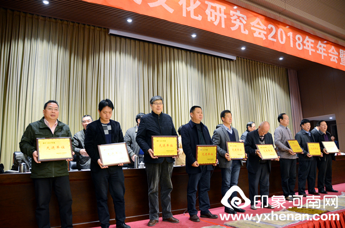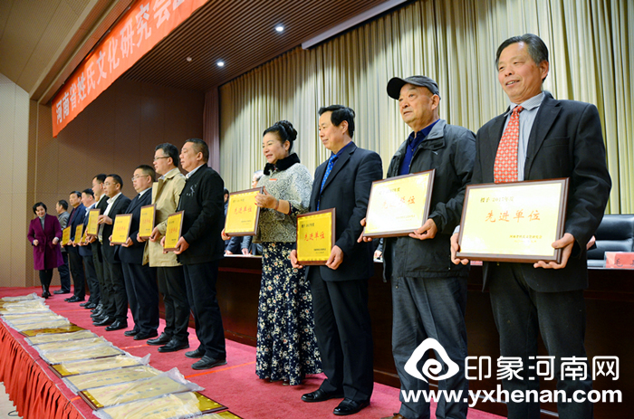 第四项议程,由河南省姓氏文化研究会副会长安国楼宣读先进单位和先进个人表彰文件,并由学会领导为先进单位和先进个人获得者颁奖。