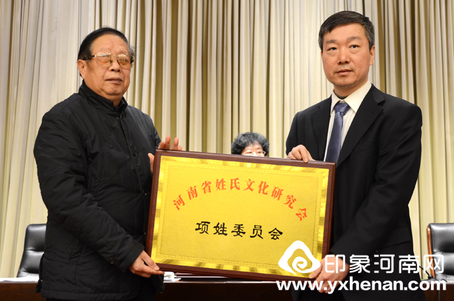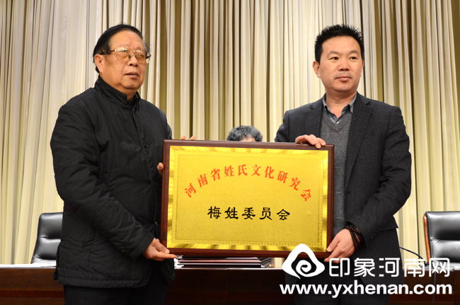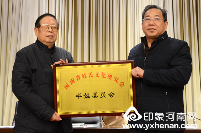 河南省姓氏文化研究会会长林宪斋分别为戴姓委员会、苏姓委员会、钱姓委员会、袁姓委员会、琚(蘧、璩)姓委员会、姬姓委员会、韩姓委员会、申姓委员会、傅姓委员会、茹姓委员会、梅姓委员会、周姓委员会、余姓委员会、阙姓委员会、褚姓委员会、项姓委员会、单姓委员会、步姓委员会、郝姓委员会、樊姓委员会、毕姓委员会等新发展的21个二级学会颁发铜牌。