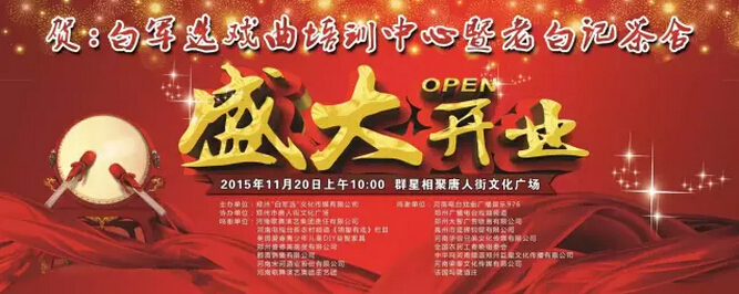 据悉,由郑州“白军选”文化传播有限公司主办,郑州唐人街文化广场协办的郑州唐人街文化广场“白军选艺术培训中心暨老白记茶舍”将于 2015年11月20号上午盛装启幕。据时,现场将有范军、李树建、胡希华、贾廷聚、虎美玲、柳兰芳、朱超伦、王洪祥、于根艺、曹随风、汤玉英等数十位重量级嘉宾莅临助兴!以戏为媒、以茶结友、戏曲曲艺大腕荟萃,戏迷票友将一饱眼福。