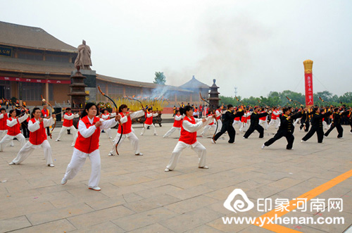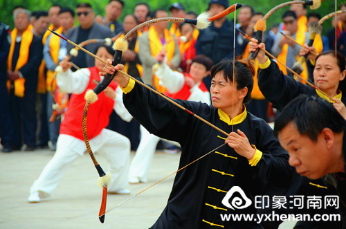 “弓舞敬拜”是由濮阳张姓研究会与太极拳师,历经数年共同研究,多次编排,以太极功夫为基础,将弓箭射击动作引伸到太极功夫展演当中,编排成“濮阳张氏太极舞”,以示中华张姓起源地——濮阳对始祖挥公的深情缅怀和无限敬仰,并颂扬了挥公发明弓矢、造福后人的旷世功勋。