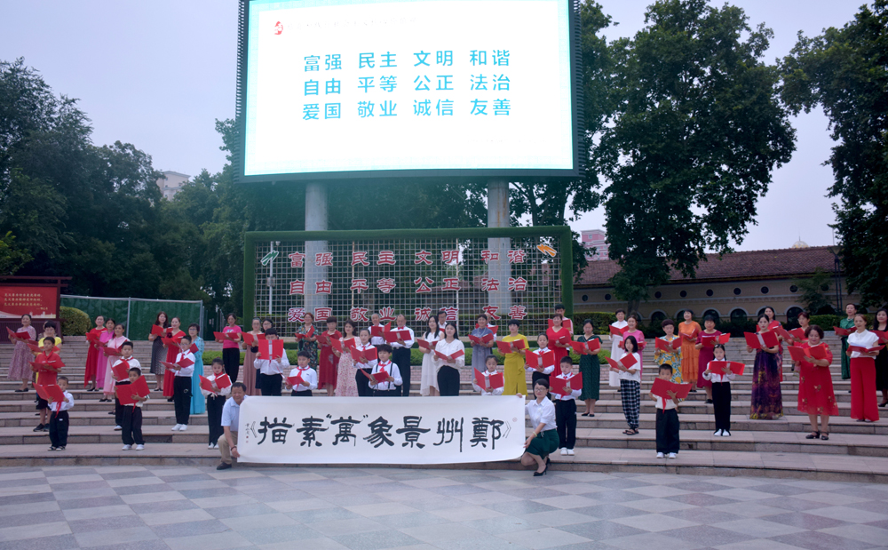蓝天绿树作背景,老中青少同上台。这种仪仗队式的实景艺术表演,受到广大市民热情赞扬和高度评价。国家级书法家黄献周先生,采用中华传统方法挥毫书写诗歌题目,特意前来助兴。郑州市众多摄影家与摄影机构,纷纷前来拍摄。