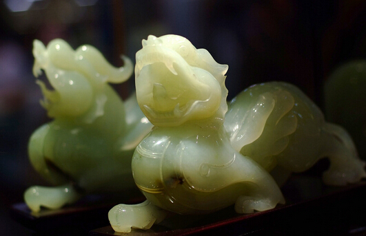 在一家经营昆仑玉的店里,一条玉制大鱼赫然出现在眼前,鱼身足有一两米长,流畅的线条,柔美的弧度,恰到好处。一眼看去,简单的几笔就把鱼的轮廓勾勒出来,细细观赏,其神韵表现的活灵活现。两道鱼须飘飞,晶莹透亮,富有生气,鱼身色泽泛青,散发着淡淡的光晕。暗青色的玉质,中间渗有丝丝白纹,细润不失温婉,低调不失深沉。细致的鱼鳞片片清晰,连鱼鳍鱼尾部位的都精雕细刻,惟妙惟肖,真是巧夺天工!最妙的是鱼身下刻有双足呈现龙形,鱼化龙,寓意为蜕变,比喻事业成功或地位高升。