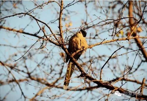 走过树、藤相依相缠的古木,看半山腰那株向下倾斜,满树黄叶的古木随风洒下片片落叶,唯美浪漫。碧云天,黄叶地,中有喜鹊在在树枝上飞来飞去,似是在欣赏这难得的冬日美景。俯首,捡起一片落叶,夹在充满墨香的书籍里,也将情思留存,记下这初冬的美好回忆。
