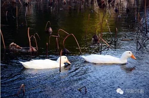 走在积雪未化的小路上,滴滴答答的雪水从树上滴落下来,落在额头,微有凉意。消融的雪水滴滴答答,散落在荷花池里,一圈圈的涟漪荡漾开来,湖面波光粼粼。枝枝残荷在水中倾斜着,带着一点白雪,或直接没入水中,别有一番韵味。散落的莲蓬在水中漂浮着,还有莲子羞涩地藏于其间,为这里增添了一份雅致。几只白鸭在水中欢快、自如地在密布残荷的湖面追逐嬉戏。湖里,那白雪覆盖、残荷围绕、树枝搭建的小窝分外精巧雅致,趣味横生,这是白鸭们的温馨家园。